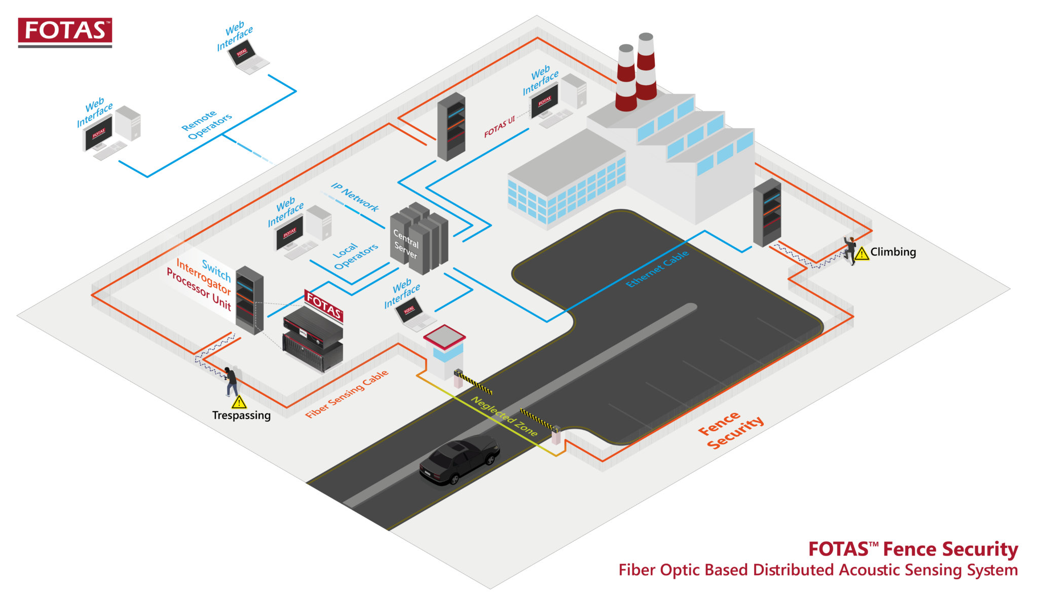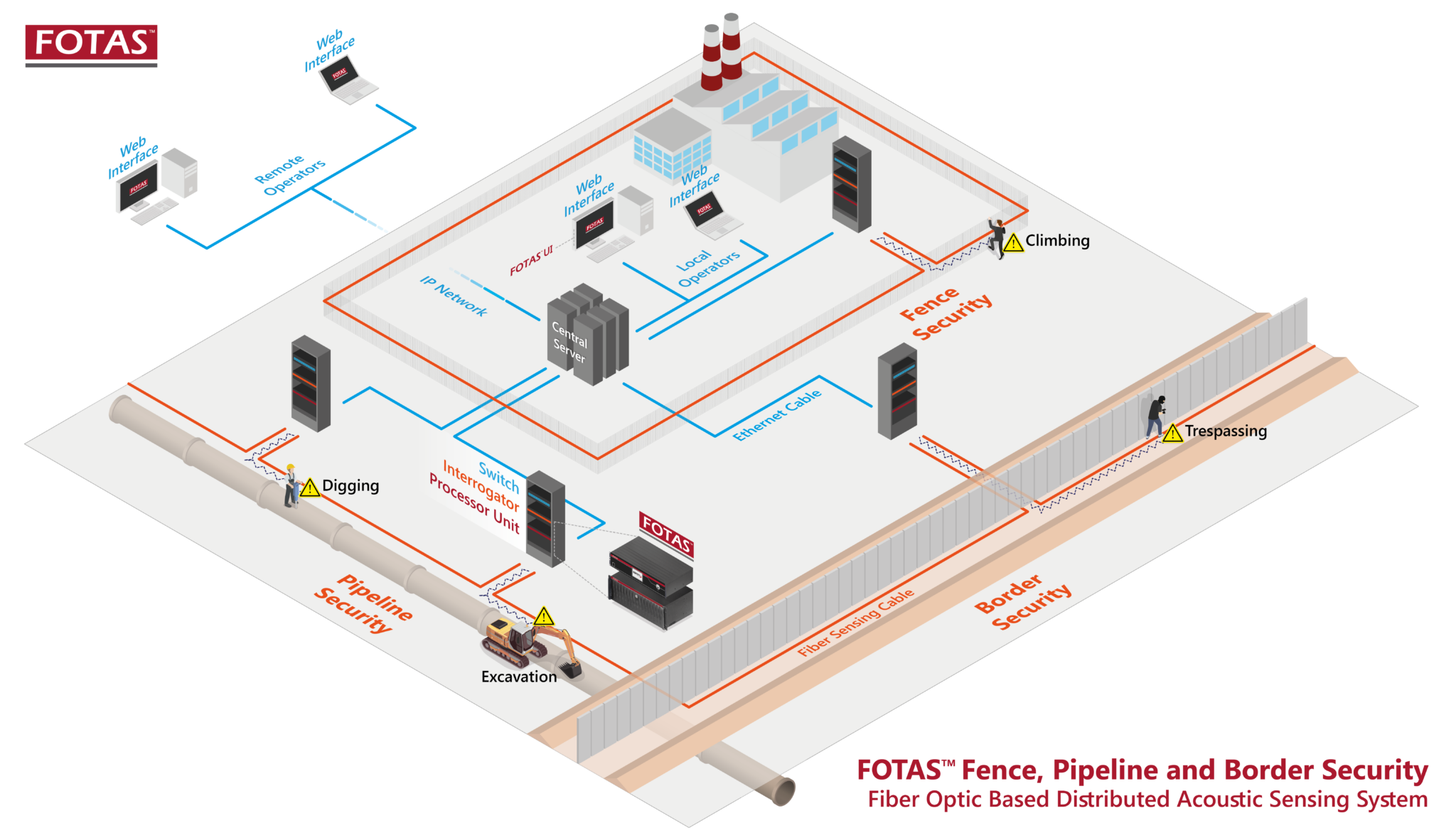FOTAS does not rely on cameras for monitoring; instead, it uses long fiber optic cables to